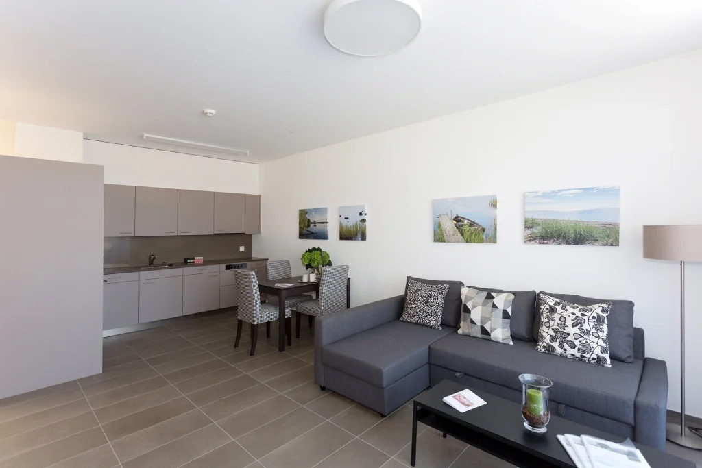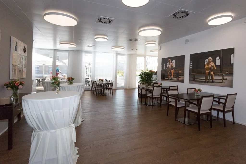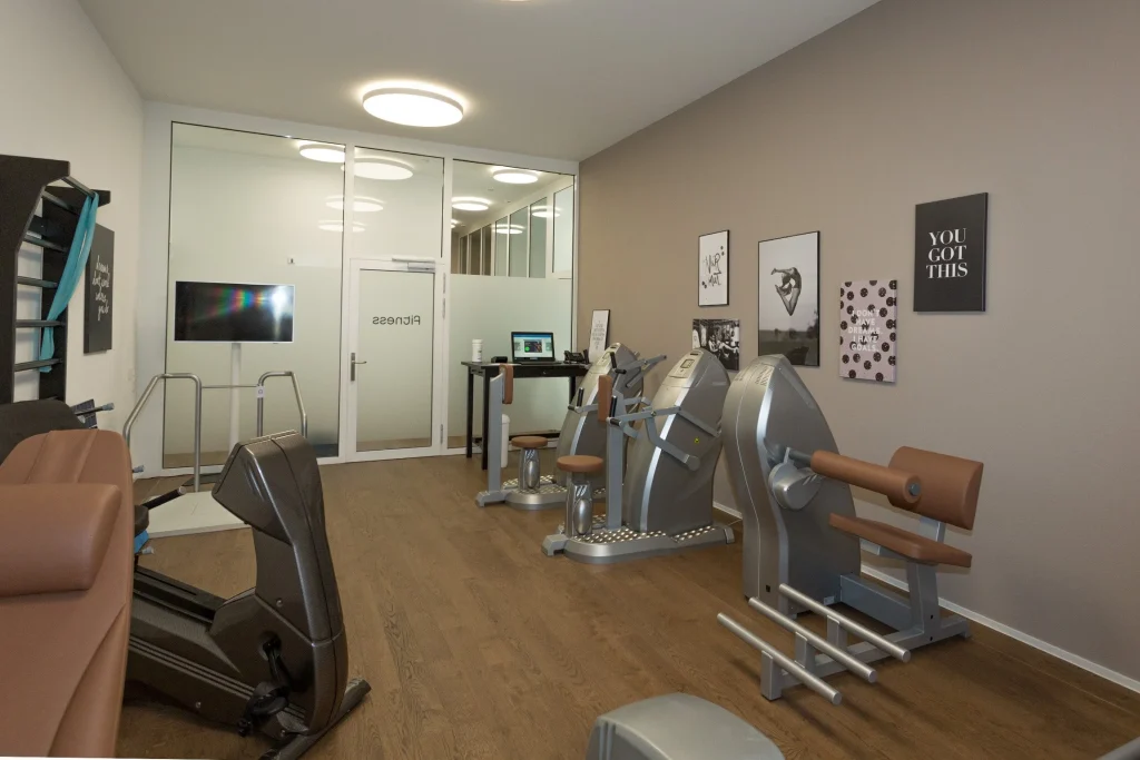 - Gemeinsame Infrastruktur: Restaurant, Aufenthaltsräume, Fitnessraum mit Trainingsgeräten